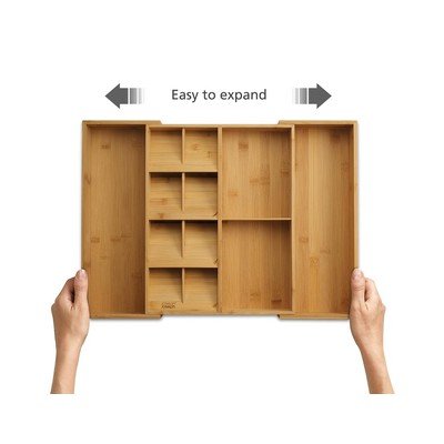Il portaposate regolabile DrawerStore Bamboo del brand Joseph Joseph è un pratico organizzatore che aiuta a mantenere l'ordine nel cassetto della cucina. Grazie alla sua disposizione intelligente, che permette di riporre le posate in diagonale e sovrapposte, si risparmia più della metà dello spazio. Le posate possono essere inserite negli scomparti indicati da entrambi i lati.