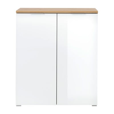 Scarpiera TeldeCon effetto rovere, in truciolato, trattamento della superficie: melamina/trattamento della superficie: trattamento con vetro, con trama lucida, bianca/di colore naturale, numero di paia di scarpe 20 , larghezza totale 89 cm, altezza totale 105 cm, profon