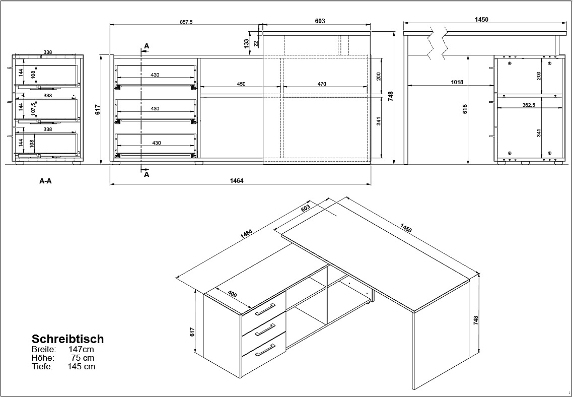 La scrivania angolare Podium del brand Germania è la scelta ideale per un uso efficiente dello spazio. Con dimensioni di 145x147 cm, offre molto spazio per lavorare e riporre. Il ripiano laterale integrato contiene tre cassetti a chiusura automatica e quattro scomparti aperti, ciascuno con una capacità di carico fino a 10 kg. Il piano del tavolo può sostenere fino a 60 kg, garantendo stabilità e durata. La possibilità di montaggio in direzione opposta aggiunge flessibilità. La combinazione perfetta di funzionalità e stile per il tuo spazio di lavoro.
