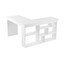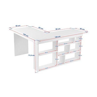 Scrivania angolare Vesper del brand Kalune Design. Grazie alla sua forma a L e ai ripiani integrati, offre un pratico spazio di archiviazione e un utilizzo efficiente dello spazio.