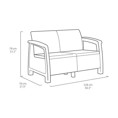 Il set di mobili da giardino Keter Corfù è composto da un divano a due posti, 2 poltrone con una comoda seduta e un tavolo realizzato con una struttura artificiale simile al rattan.
