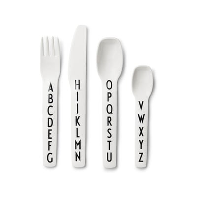 Posate per bambini4 pz, in plastica, bianca, 1x cucchiaio/1x forchetta/1x coltello/1x cucchiaino