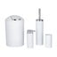 Il set comprende una tazza per spazzolino da denti, un dispenser di sapone con pompa, un cestino per rifiuti con un volume di 6,5 litri e un pratico sportello per facilitare lo svuotamento, nonché un set da toilette con spazzola e testina sostituibile con una larghezza di 6,5 cm. Lo scopino è dotato di setole flessibili in plastica che puliscono efficacemente e non graffiano il WC.