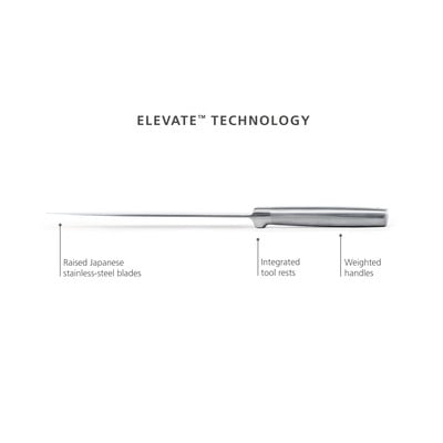 I coltelli sono dotati di manici ergonomici con poggiapiedi Elevate per garantire un uso confortevole e sicuro. Il set comprende anche un pratico organizer in bambù per tenere i coltelli in ordine e al sicuro.