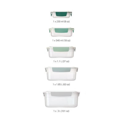Nel set sono inclusi cinque contenitori con una capacità di 230 ml, 540 ml, 1,1 l, 1,85 l e 3 l. Una volta impilati, misurano 20 x 24,5 x 16,3 cm.
