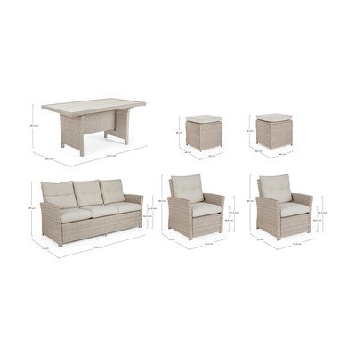 Il set Ariel offre spazio sufficiente per ospitare comodamente fino a sei persone. Il divano misura 186,5 x 76 x 89 cm, le poltrone 145,5 x 85,5 x 69,5 cm e gli sgabelli 42 x 42 x 40 cm. Il tavolo da 76 x 75,5 x 89 cm offre lo spazio sufficiente per appoggiare spuntini e bevande.