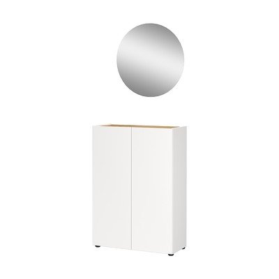 Il set da ingresso Alviano è composto da una scarpiera e da uno specchio rotondo. La scarpiera è dotata di due ante, dietro le quali si trovano tre ripiani. I ripiani sono regolabili in altezza e ciascuno ha una capacità di carico fino a 5 kg. La parte superiore e inferiore della scarpiera hanno una capacità di carico fino a 15 kg. Il set Alviano offre spazio per 12 paia di scarpe.
