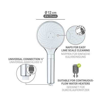 Il soffione per doccia Water Saving del brand Wenko trasforma la doccia quotidiana in un'esperienza ecologica. Combina un design moderno con una tecnologia avanzata per il risparmio idrico, garantendo un comfort ottimale e riducendo significativamente il consumo d'acqua. Grazie al regolatore WaterSaving integrato, è possibile impostare il flusso a soli 9 litri al minuto, il che rappresenta un risparmio di almeno il 35% rispetto ai soffioni doccia standard. Questo soffione, con un diametro di 12 cm, non solo migliora l'aspetto del bagno, ma contribuisce anche a proteggere l'ambiente risparmiando acqua ed energia. Goditi un'esperienza doccia personalizzata con tre funzioni regolabili, che soddisfano sia le preferenze delicate che quelle più intense. Grazie al collegamento universale, l'installazione è semplice e il soffione è compatibile anche con scaldabagni istantanei, garantendo un'integrazione senza problemi in qualsiasi bagno.