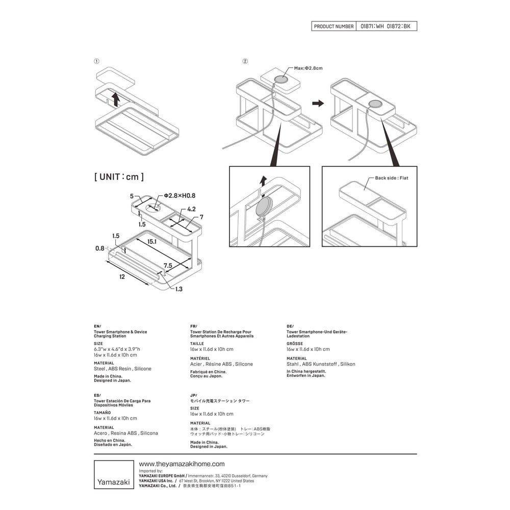 Il pratico supporto di Yamazaki consente di riporre e caricare tutti i dispositivi in un unico posto. Nella parte superiore è presente un foro per i cavi e un cuscinetto in silicone per lo smartwatch. Nella parte inferiore è presente un supporto per il telefono, il tablet e uno spazio per altri accessori.