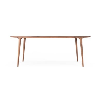 Questo tavolo da pranzo Gazda Fawn è realizzato in legno massiccio di noce. Su questo tavolo non è presente alcuna trave (una trave di legno che collega le gambe appena sotto il piano del tavolo). Infatti, il suo piano è rinforzato con rinforzi in acciaio, che impediscono alle dimensioni del legno di cambiare a causa dell'umidità. Anche le gambe smontabili sono in legno massiccio e si integrano perfettamente con il resto.