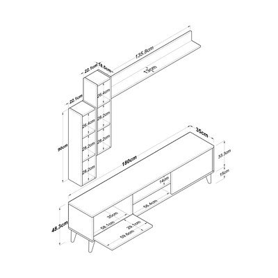 Con effetto noceIn MDFTrattamento della superficie: melaminaBianco/di colore naturaleLarghezza totale 180 cmAltezza totale 48 cmProfondità totale 35 cm