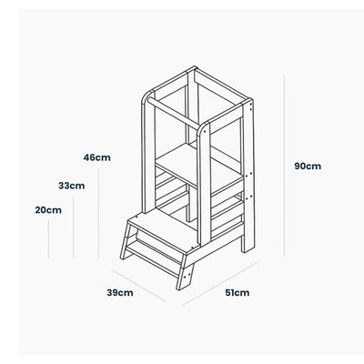 La robusta struttura in legno della torre è progettata per garantire la massima sicurezza e promuovere l'indipendenza dei bambini. La piattaforma può essere facilmente regolata a tre diverse altezze - 20 cm, 33 cm e 46 cm dal pavimento - senza bisogno di attrezzi.